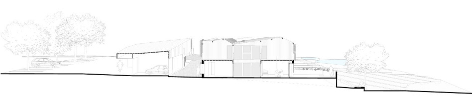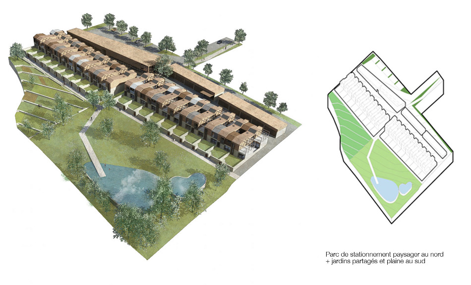 La première consiste à donner, depuis l’accès nord du site, une place définie à l’automobile, de manière à ce qu’elle ne vienne pas interférer avec la vie sociale des usagers. Cette séquence est composée dans un premier temps d’un parc de stationnement paysager, marquant une distance minimum avec les habitations au nord du site, ainsi qu’une protection solaire naturelle. Dans un second temps, sont implantés les garages/ateliers couverts, qui définissent la limite avec la deuxième séquence et se présentent comme des volumes flexibles dans le temps.