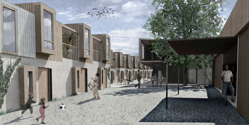 La deuxième séquence prend donc la forme d’une rue, tenue au nord par ces locaux à usages non prédéfinis et au sud par les logements. C’est dans cette interface entre public et privé que nous cherchons à retrouver cette cohésion sociale propre à un mode de vie rural et si présente dans l’histoire du coron.