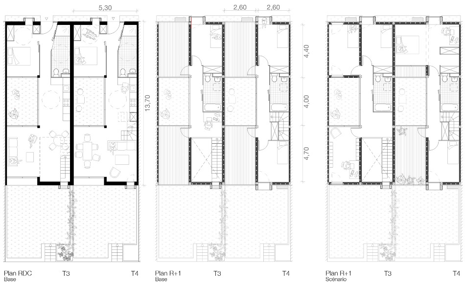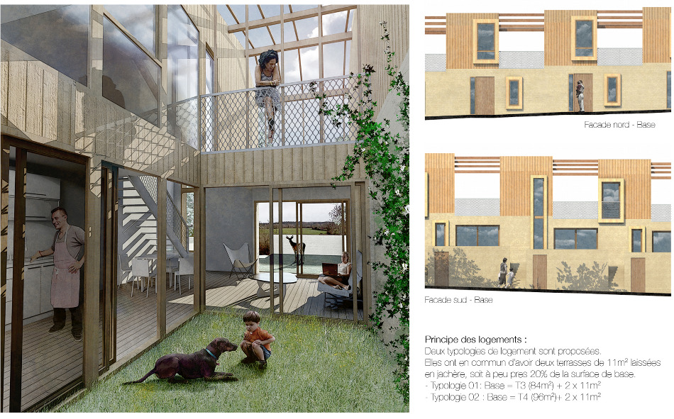 Ces derniers se développent selon deux typologies (T3 et T4) à base similaire. C’est à dire des logements sur deux niveaux, composés autour d’un patio permettant une ventilation et un éclairage naturel pour chaque pièce.